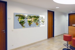Gänge, der Empfang und Konferenzräume einer internationalen Wirtschaftskanzlei sollten explizit mit Fotokunst aufgewertet werden; die Entscheider der Kanzlei wollten die Branchen ihrer Kunden visualisieren sowie ihre eigenen Firmenstandorte darstellen. Außerdem sollte ein langer, dunkler Gang mit einem Naturmotiv aufgewertet werden.