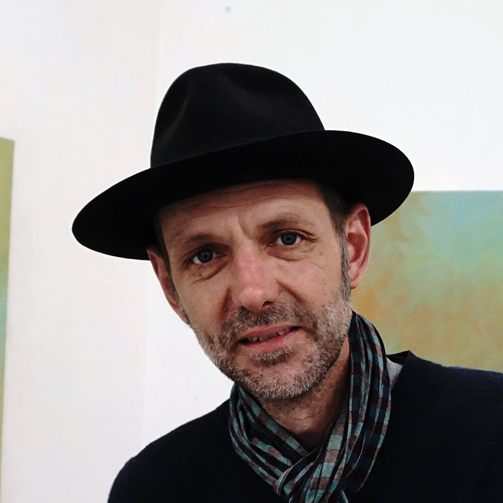 Ich stehe mit Rasso Hecker in seinem Atelier. Gleich gegenüber der Eingangstür leuchten mir vier seiner azurfarbenen „Wogenbilder“ entgegen. Ein fünftes Gemälde aus dieser Reihe baut sich tiefblau auf. Es sind die klassischen Farben Preußischblau oder Pariser Blau, die er bevorzugt verwendet. Ein Blau, so Rasso, dass man fast ins Schwarze „hineinreiben“ kann. „Dieses unergründliche Blau in Verbindung mit Indischgelb ergibt ein unfassbares Grün“, ergänzt er.